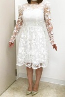 157cm体重49kg、丈はひざが見えるくらいでサイズ感は丁度良かったです。デコルテ肩まわりのデザインは撫で肩をカバーしてくれて、結婚指輪を身につけた手の撮影では袖口のレースが上品な印象になり、格を上げてくれました!