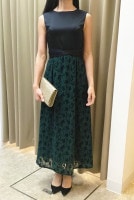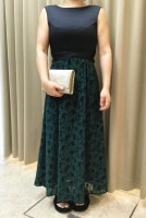 丈は足首の10cm上くらい。サイズ感はぴったりで、バストやウエストがフィットし、安心感があります。ウエスト位置が高いため、脚を長くスタイル良く見せてくれます。シルエットがとても綺麗です。高身長なら足首が見えるので着やせしますし、低身長さんでもローヒールで十分着用可能な丈感です。シックなグリーンがおしゃれな雰囲気。華やかすぎないので年齢を問わずおすすめです。